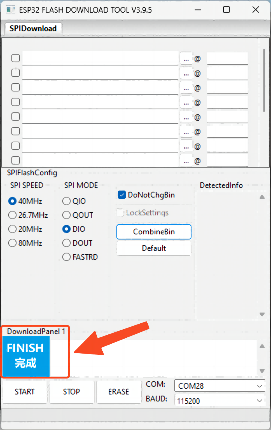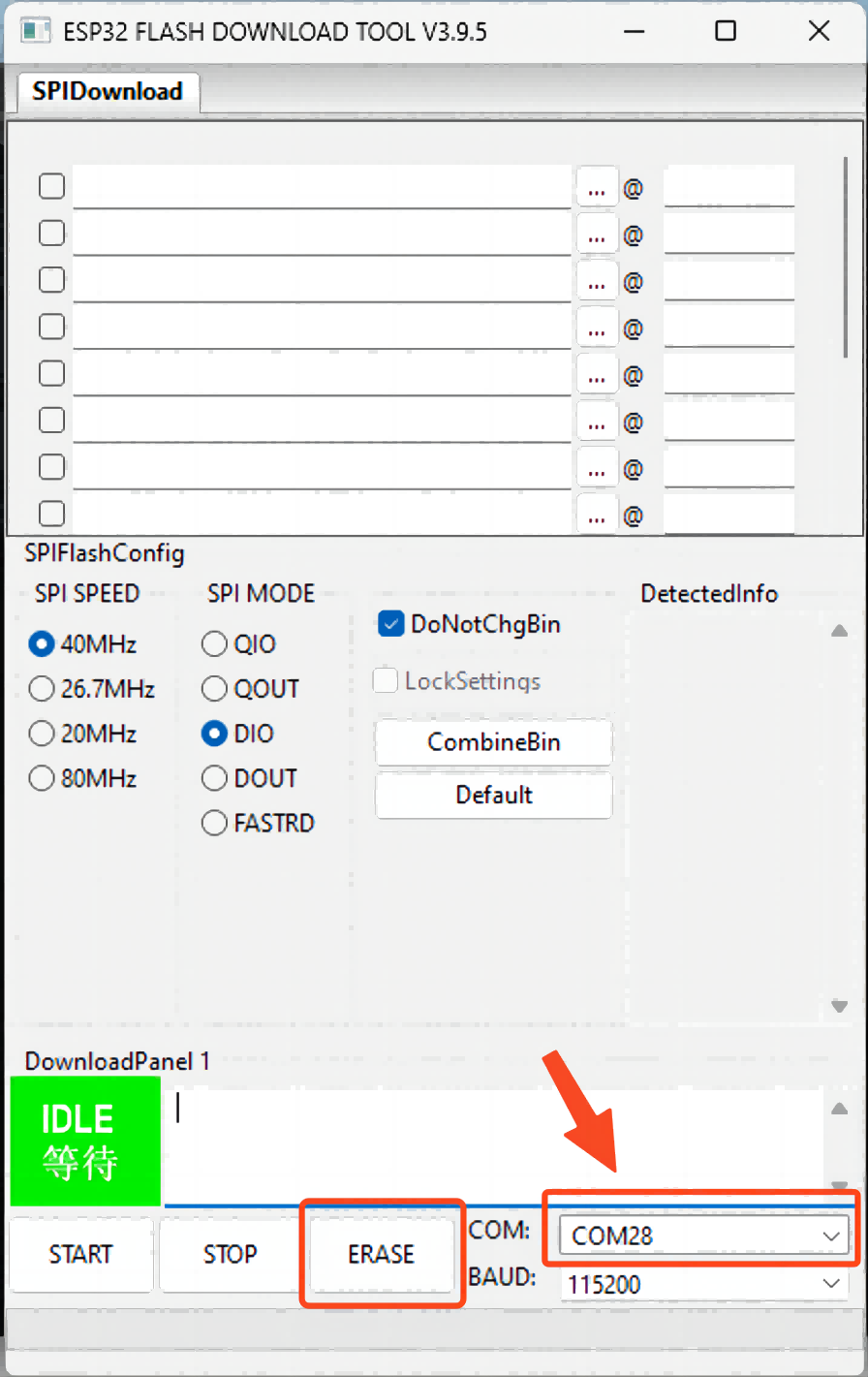 At the bottom right, select the serial port number we checked in step two from the COM drop-down menu. If you have more than one device connected, make sure you do not select the wrong one to avoid accidentally erasing another device's flash or causing an error. Once you have made your selection, click the ERASE button to start the erasing process. Wait a while and when you see "FINISH" it means that the flash chip has been successfully erased.