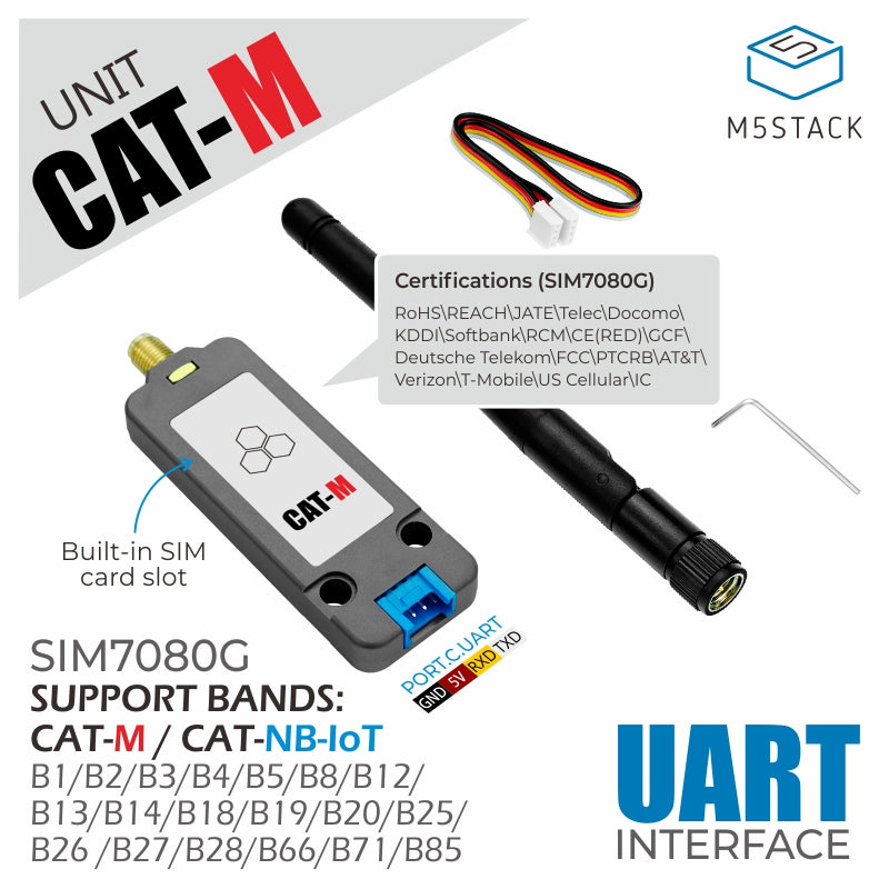 CatM Unit is an international version of a dual-mode wireless communication module. It is based on the 'SIM7080G' module, which supports both 'CAT-M' (Category M) and 'NB-IoT' (Narrowband Internet of Things) communication technologies. This module provides reliable communication for IoT (Internet of Things) applications.