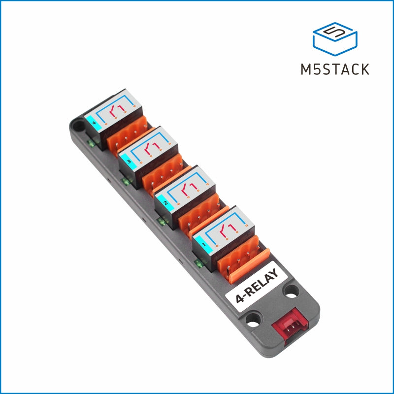 4-Relay Unit is a unit that integrates four relays and is controlled via the I2C interface. Each relay is capable of controlling voltages up to AC-250V/DC-28V, with a rated current of 10A and the ability to withstand an instantaneous current of up to 16A. Each relay can be controlled separately and there is a programmable status LED for each relay.