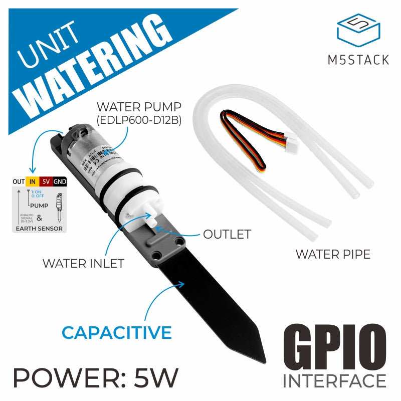 Watering unit is a capacitive soil moisture detection and adjustment unit designed for intelligent plant breeding scenarios. It combines a water pump with measuring plates for soil moisture detection and water control. This product enables easy humidity detection and irrigation control for plants.