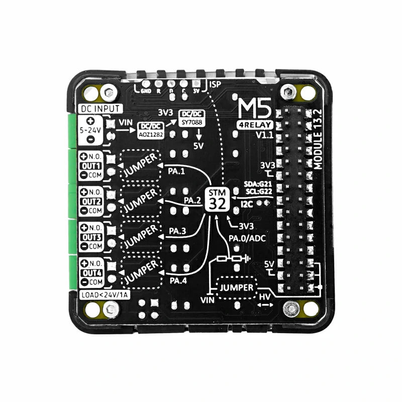 This relay module is specifically designed for DC circuit switching, providing a maximum load capacity of 24W (DC 24V @ 1A) across its 4 channels. It also includes built-in external power voltage detection and a DCDC circuit to power the controllers, enhancing overall safety and stability.