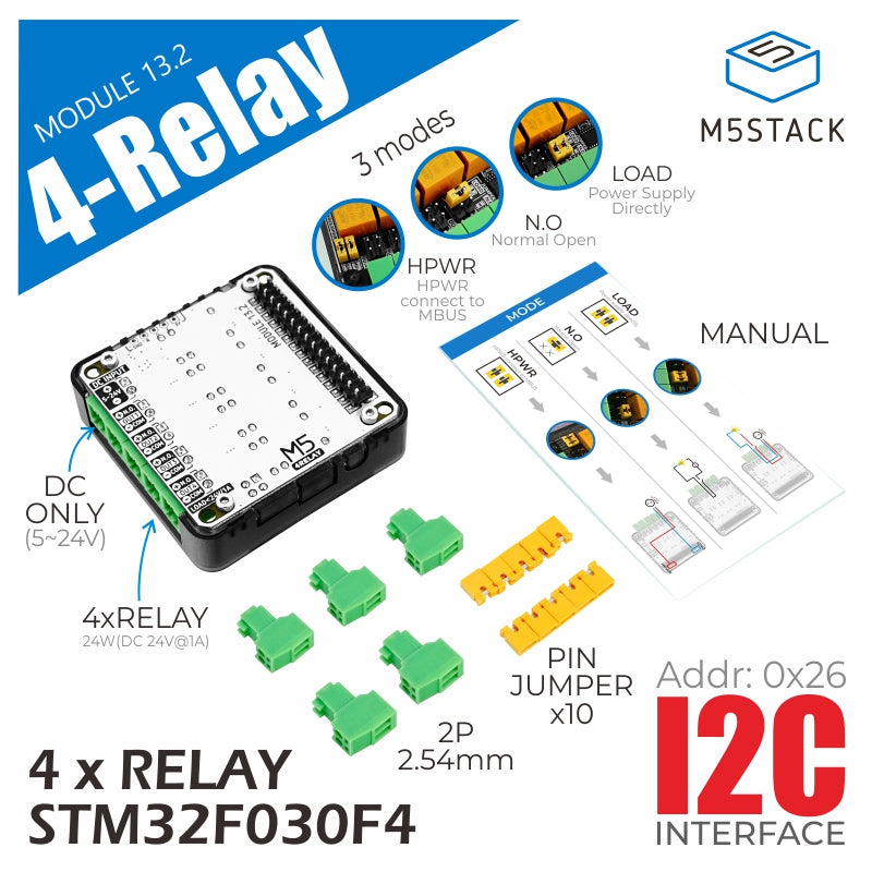 4-Relay Module is a 4-Channel Relay module compatible with M5Stack Core and Core2 series, with 4-channel mechanical relays