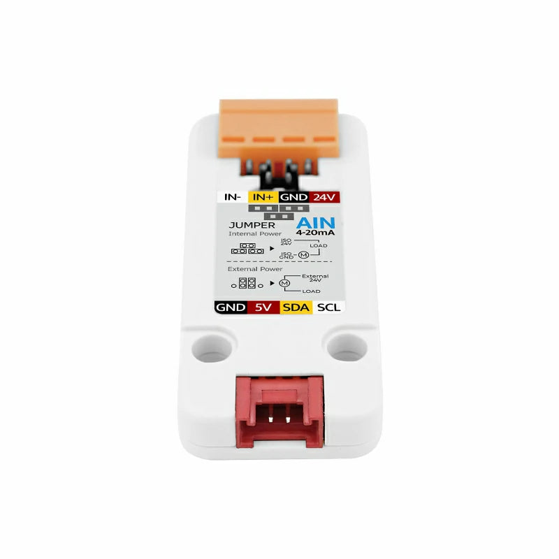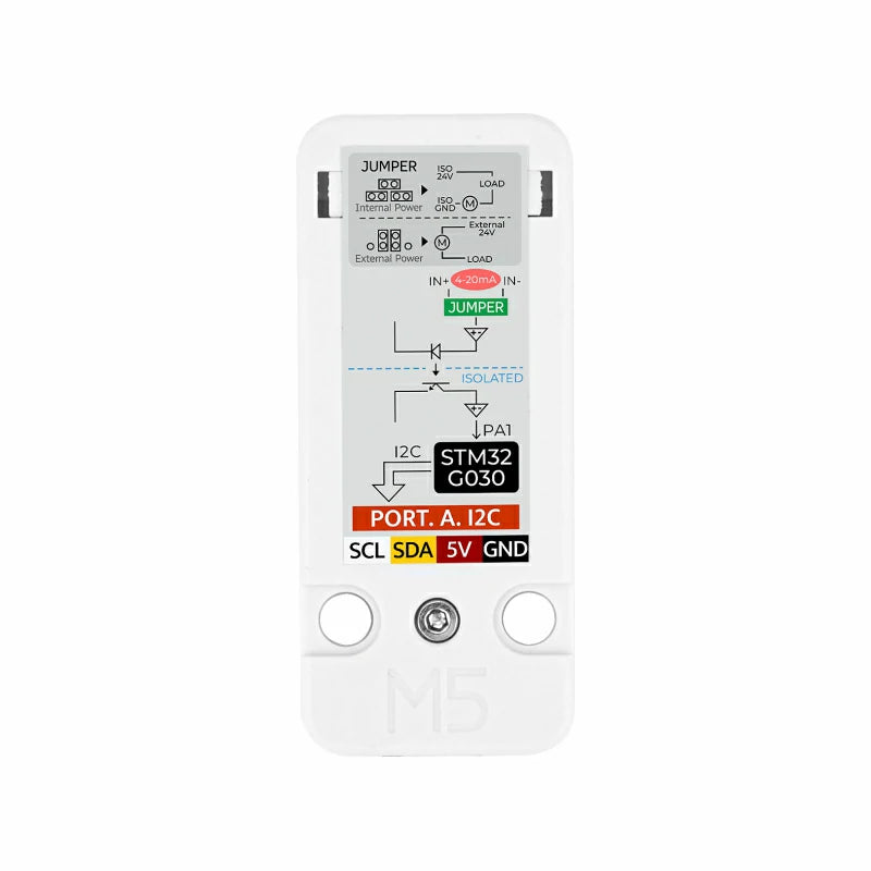 AIN4-20mA Unit is a highly capable single-channel 4~20mA current analog measurement unit. Powered by the STM32G030F6 main control chip, it communicates seamlessly with the M5 host through i2c, ensuring efficient and reliable data transmission.