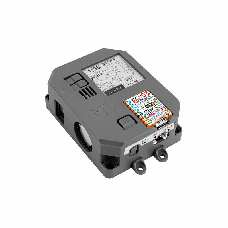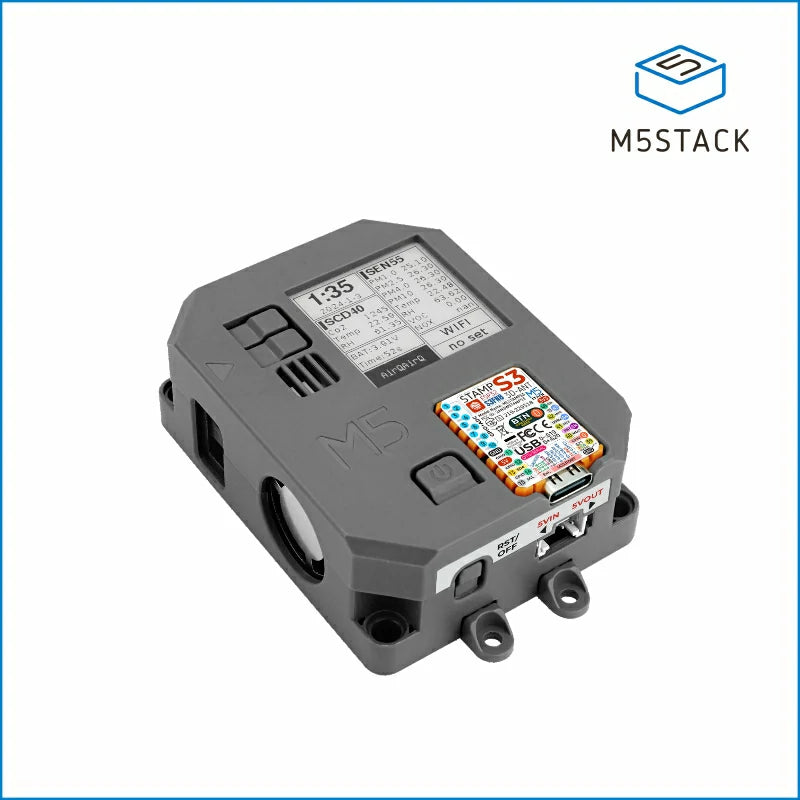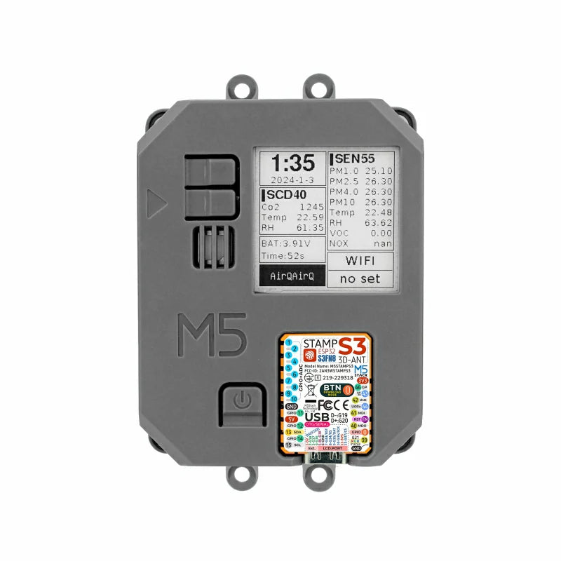 Air Quality Kit is an integrated, low-power air quality monitoring device designed to provide comprehensive air quality monitoring solutions. It features multiple components, including the SEN55 air quality sensor and the SCD40 CO2 sensor, enabling the monitoring of PM1.0, PM2.5, PM4, PM10 particles, temperature, humidity, VOC, and CO2 concentrations. Powered by the StampS3 main controller and equipped with 8M Flash memory, Air Quality ensures efficient data processing and storage capabilities.