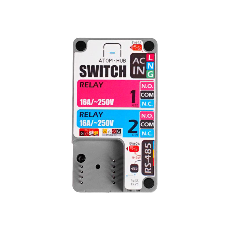 Leveraging ATOM's built-in Wi-Fi functionality, the ATOM HUB SWITCH allows for convenient remote control of connected switch devices. Moreover, if you have multiple ATOM HUB SWITCH units, they can be easily connected in parallel using the RS485 interface, expanding the scope of your control capabilities.