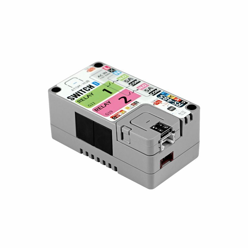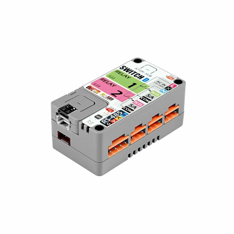 In addition to powering the relay loads, the input power supply is also passed through a built-in step-down module to provide the ATOM with a 5V/1A DC power supply. To ensure safety of use, the power input circuit has overheating and short-circuit protection. It effectively disconnects the circuit in the event of excessive current or short circuit to prevent damage to components. Switch D incorporates the SP485EE level conversion chip, which provides an RS485 communication interface to support communication with multiple devices. It also has a built-in 9-24V to 5V step-down circuit to meet the power requirements in industrial scenarios and extend the power supply capabilities. A set of HY2.0-4P interfaces is provided for connecting I2C peripherals or general purpose I/O devices. Combined with ATOM's built-in WiFi functionality, the ATOM HUB SWITCH D enables quick setup of remote device switching applications.