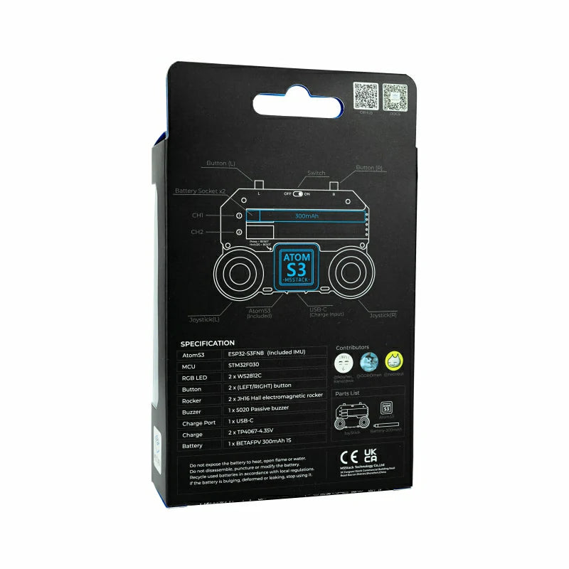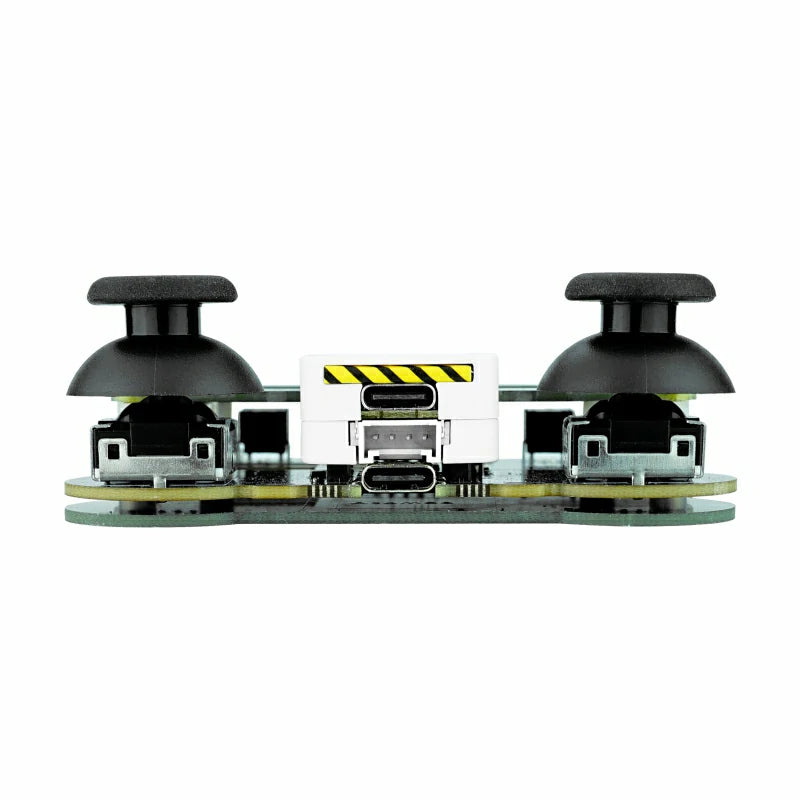 M5Atom Joystick is a versatile programmable dual-joystick remote controller featuring the AtomS3 as the main controller, with an STM32 handling co-processing functions. It is equipped with two 5-way joysticks with hall sensors, two function buttons, and built-in RGB LEDs for human-machine interaction and status indication. The device includes two high-voltage battery charging circuits. It comes pre-loaded with the Stamp Fly control firmware and communicates with Stamp Fly via the ESP-NOW protocol. The firmware source code is open-source. This product is suitable for drone control, robot control, smart cars, and various DIY projects.