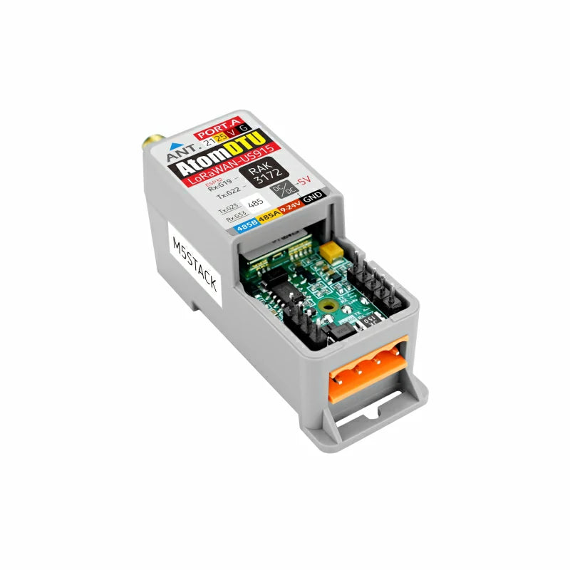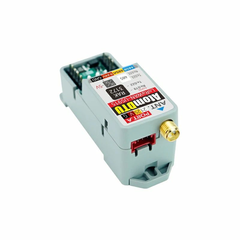 Atom DTU LoRaWAN-US915 is a LoRaWAN programmable data transmission unit (DTU) designed for the 915 MHz frequency band, specifically tailored for the US915 band, suitable for the United States and other regions using the US915 band. This module employs the STM32WLE5 solution, supporting long‑range communication with low power consumption and high sensitivity. The module features a built‑in LoRaWAN protocol stack, supporting Class A, Class B and Class C operation modes for easy connection to various LoRaWAN server platforms such as TTN, ChirpStack, Actility, Tencent Cloud, etc.; it also supports LoRa® point‑to‑point (P2P) communication mode and uses a UART communication interface (controlled via the AT command set) for flexible configuration, and integrates an RS485 communication interface to provide reliable wired connectivity for industrial field devices. The product uses a high‑performance rubber‑duck antenna, with an optimized design to deliver more stable signal coverage and longer communication range, suitable for a variety of complex environments. In LoRaWAN mode, the module can act as a node to connect to a gateway for data collection and management; in P2P mode, it can achieve direct device‑to‑device communication without a gateway. Structurally, the module features a standard 35 mm DIN rail slot at its base, allowing direct installation on industrial rails for quick deployment and maintenance in cabinets or distribution boxes. It is widely used in long‑range, low‑power IoT communication scenarios such as smart agriculture, industrial monitoring, and environmental monitoring node deployments.