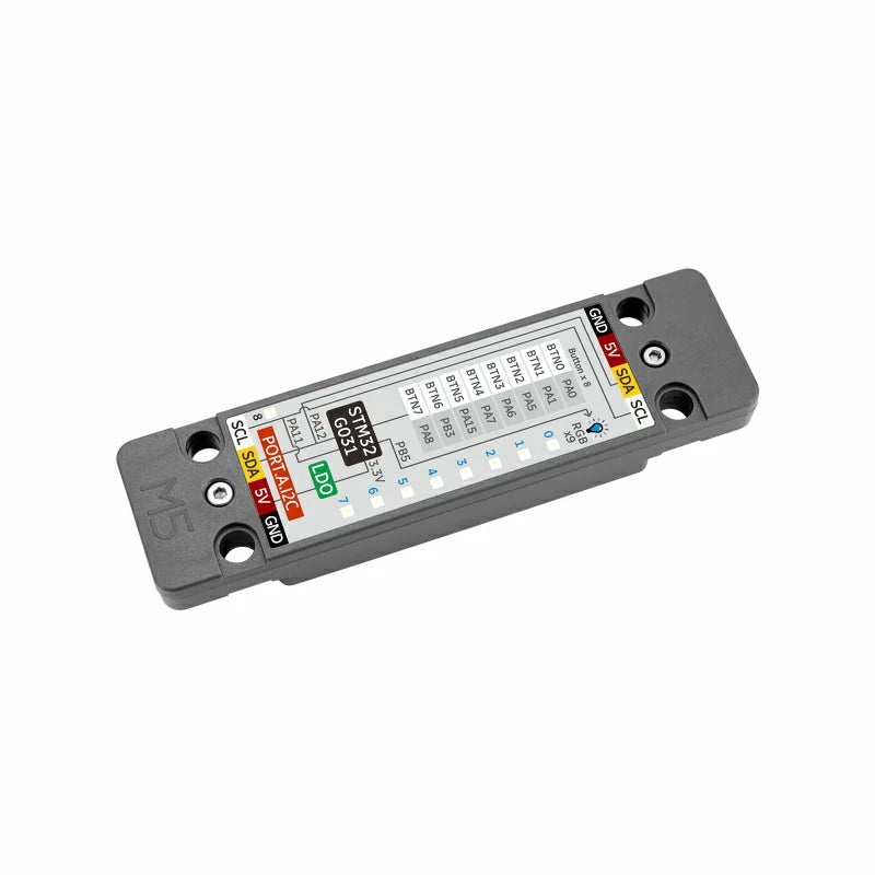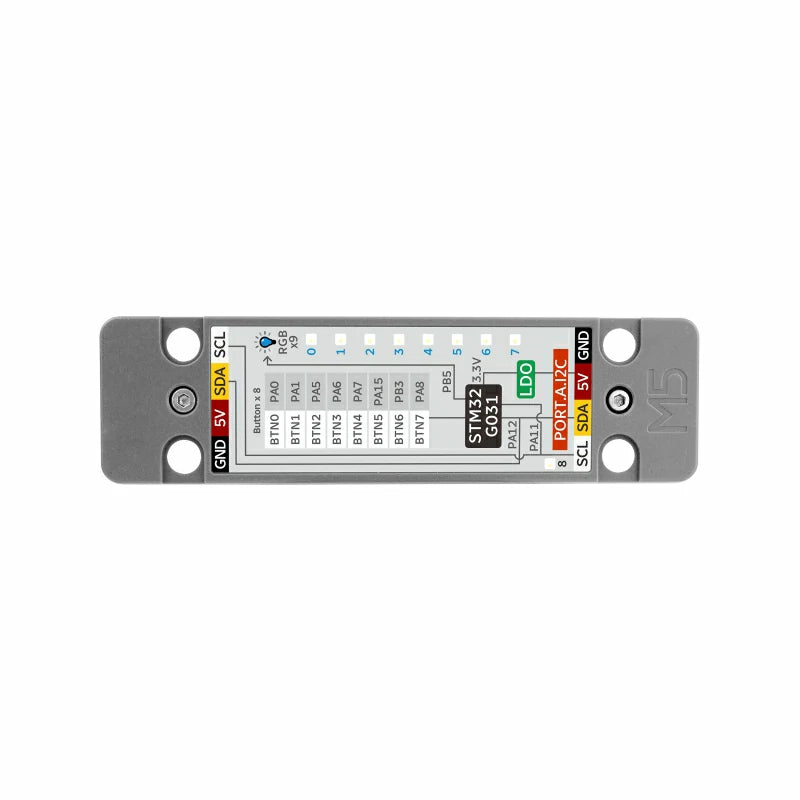 Unit ByteButton is an 8-button touch switch input unit equipped with 8 button inputs and 9 WS2812C RGB LEDs. It uses the STM32 microcontroller and supports I2C communication. The board includes two Port A interfaces and supports cascading multiple Unit ByteButton modules, making it suitable for complex systems. It can achieve button input detection and dynamic lighting feedback, ideal for smart home control, gaming devices, educational platforms, industrial status displays, and interactive exhibitions.