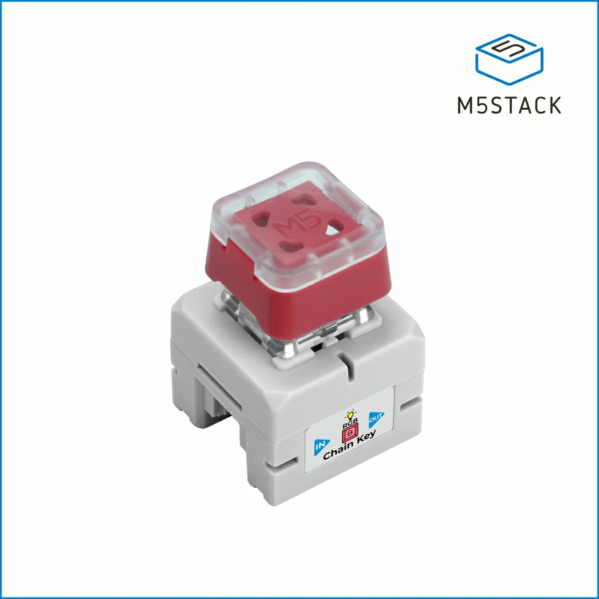 Chain Key is a single-button input node in the M5Stack Chain series. The button adopts a hot-swappable mechanical keyboard design with a blue tactile switch and integrates a programmable RGB LED. It is suitable for human-machine interaction and smart home control scenarios.