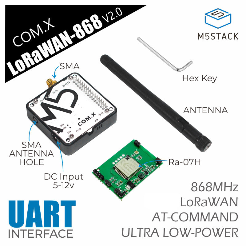 COM.LoRaWAN868 v2.0 is a LoRaWAN communication module suitable for 868MHz frequency launched by M5Stack. The module adopts the ASR6501 scheme, which supports long-distance communication and has high sensitivity characteristics. The module integrates the LoRaWAN protocol stack, adopts the serial communication interface (using AT command set for control), and can be used as a collection node for a large number of access gateways for data collection management. This module is suitable for long-distance low-power IoT communication applications, such as the deployment of environmental monitoring nodes.