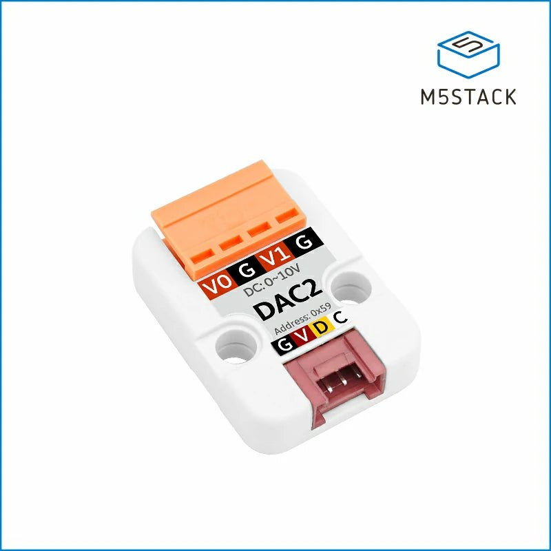 DAC2 Unit is an I2C digital-to-analog signal conversion unit. It utilizes the GP8413 solution, which provides high precision and accuracy in its performance. This chip can linearly convert a 15-bit digital value into two independent analog voltages of 0-5V or 0-10V. The output voltage error is only 0.2%, and it achieves linearity of up to 0.01%.
