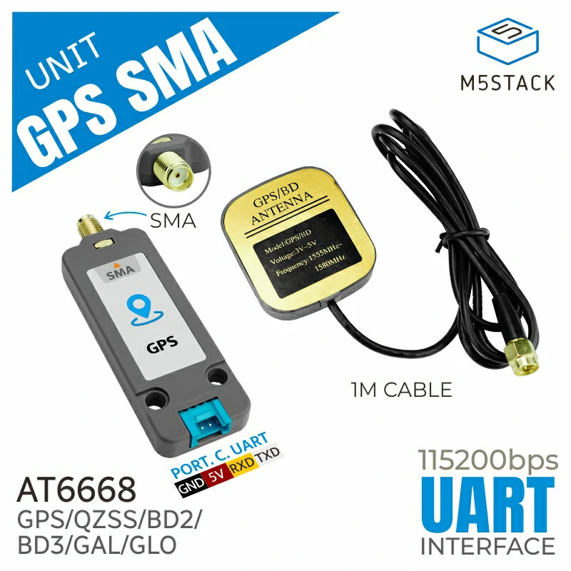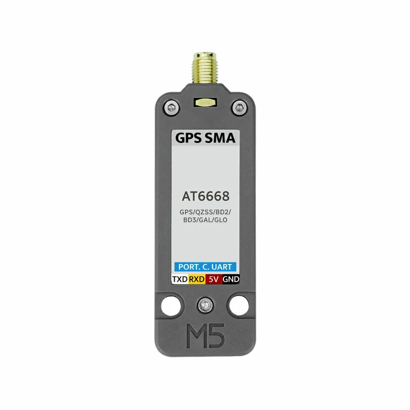 Unit-GPS SMA is a GNSS global positioning and navigation unit, integrating the high-performance ATGM336H navigation module from Microelectronics, based on the AT6668 chip design. It is equipped with an external active antenna, offering more precise and reliable satellite positioning services. Compared to previous models, the AT6668 supports multi-frequency and multi-mode GNSS signal reception, enabling compatibility with multiple satellite navigation systems (including GPS, BD2, BD3, GLONASS, GALILEO, and QZSS). It supports combined multi-system positioning or single-system independent positioning, offering enhanced interference resistance and higher positioning accuracy. This module is well-suited for high-accuracy positioning applications such as vehicle navigation, IoT location devices, and more, even in weak signal areas.