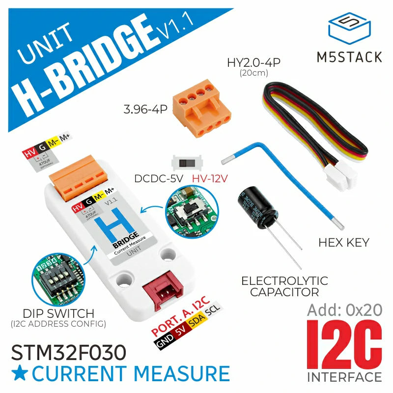 Meet the HBridge v1.1 Unit – a state-of-the-art DC motor drive module that redefines motor control. Powered by the "STM32F030+RZ7899" scheme, this module enables seamless I2C communication with the M5 host, offering precise PWM control for speed adjustment, as well as easy management of forward, reverse, and braking functions.