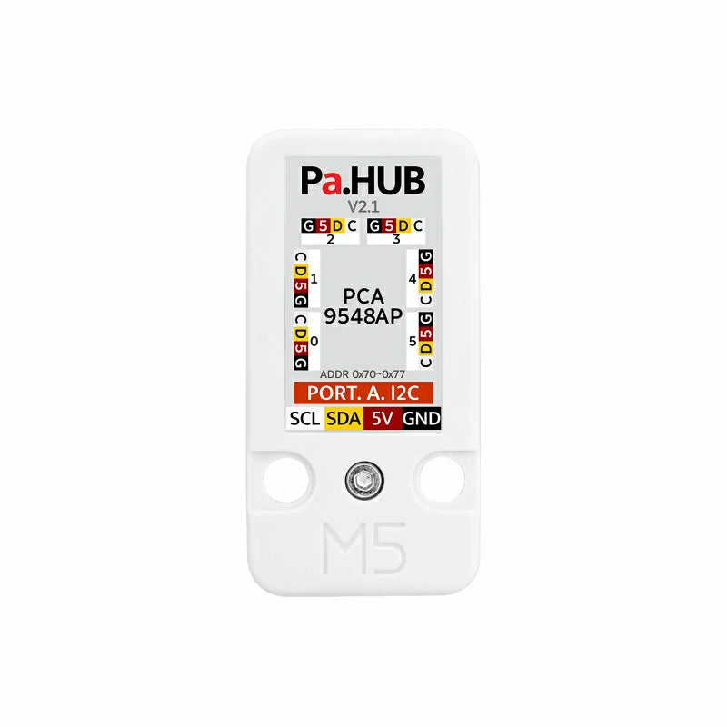 Unit PaHub v2.1 is an I2C multiplexer unit utilizing the PCA9548AP chip, capable of expanding a single I2C interface into six channels. By selecting different channels, it allows multiple devices with the same or different I2C addresses to coexist on the same I2C bus (switching via channel polling). The module features an onboard DIP switch for easy adjustment of the Unit PaHub v2.1's I2C address, supporting multiple-unit cascading to connect more I2C devices. Compared to its predecessor, it offers greater flexibility and scalability in parallel I2C device usage scenarios. This product is ideal for applications requiring simultaneous use of multiple I2C devices.