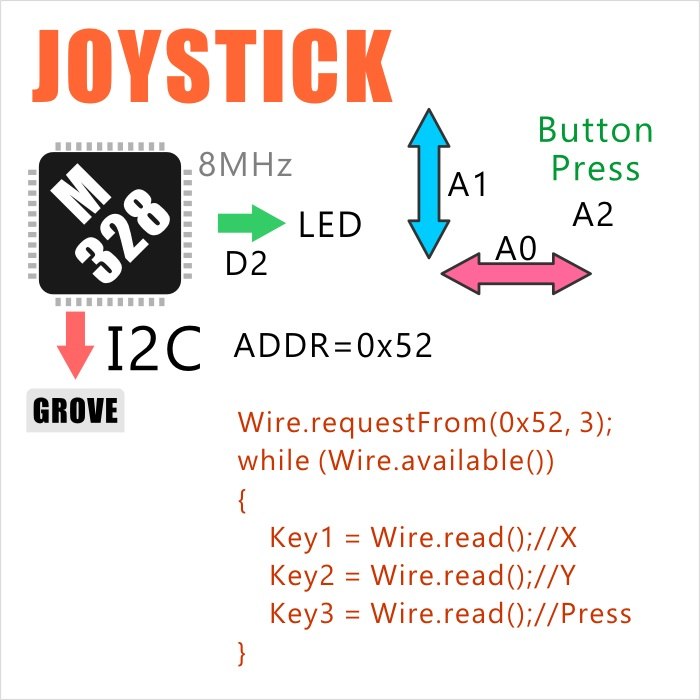 Joystick is a joystick control input unit, adopts I2C communication interface, supports three-axis control signal input (X/Y-axis offset analog input, Z-axis key digital input). Suitable for application scenarios such as games/robot control.