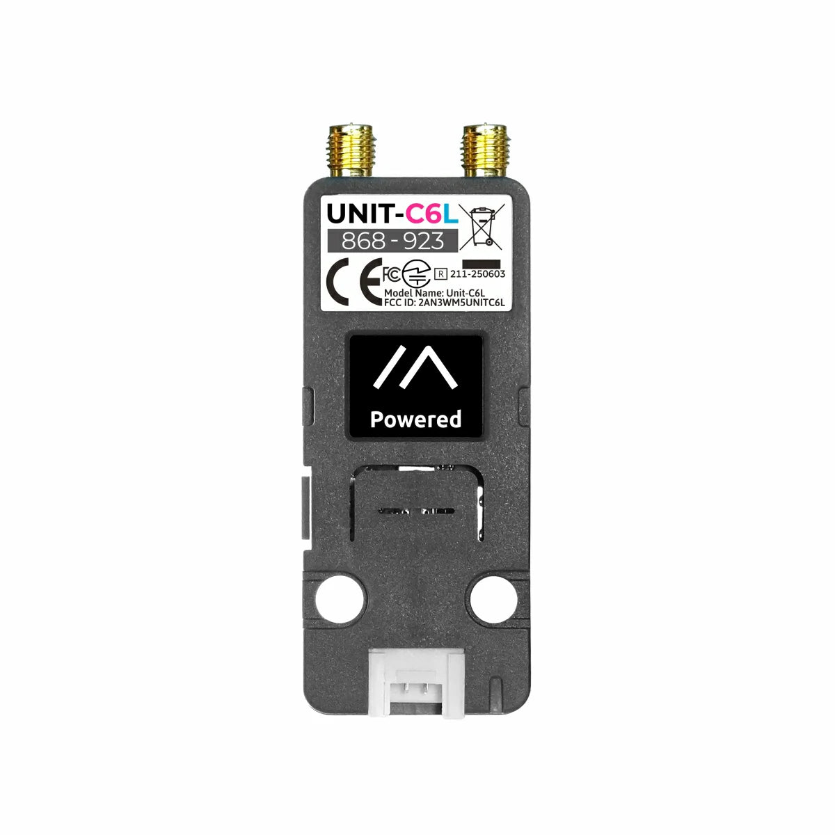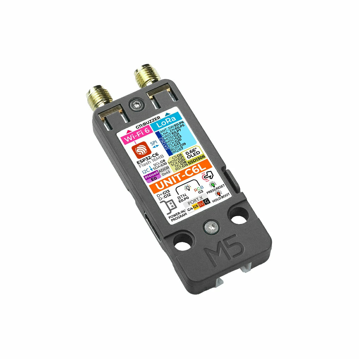 Unit C6L is a highly integrated LoRa communication unit, equipped with the Stamp C6LoRa module (featuring ESP32-C6 as the core controller, integrating SX1262 LoRa transceiver and RF switch circuit), supporting 868 ~ 923 MHz operating frequency range. Unit C6L integrates a 0.66" OLED monochrome display, programmable RGB indicator, buzzer, and user button, providing intuitive human-machine interaction. The device supports connection to the Meshtastic network or secondary development, enabling rapid deployment of private LoRa networks, suitable for remote monitoring, outdoor exploration, and emergency communication scenarios. In hardware design, Unit C6L offers 2x SMA antenna interfaces, respectively for 2.4 GHz Wi-Fi 6 and LoRa communication, ensuring scalability and stability of wireless performance. It also integrates over-voltage protection chip AW32901FCR to enhance device stability. With HY2.0-4P expansion interface and LEGO-compatible mounting holes, users can easily expand sensors or modules to quickly build more application scenarios.