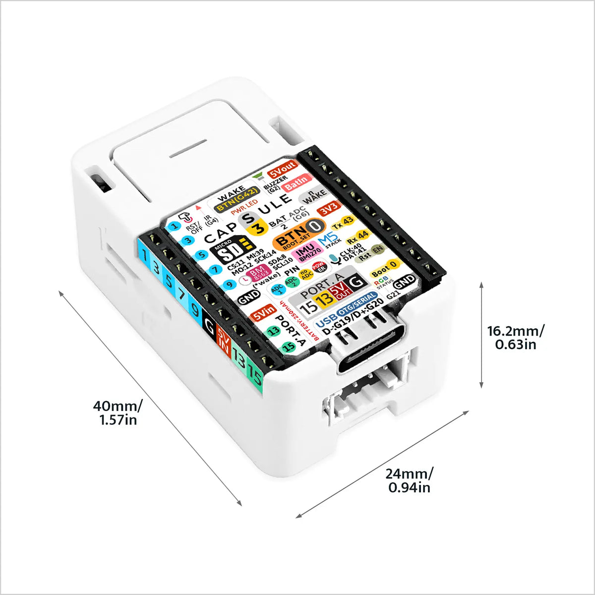 Capsule is a multifunctional embedded development platform using Stamp-S3 as the core controller, integrating key functions such as sensors, power supply, storage, and control. It features a high-performance BMI270 IMU for precise motion tracking and attitude control, an SPM1423 microphone sensor for recording, voice recognition, and wake-up, and an infrared sensor for remote control. For power supply, the platform has a built-in 250mAh battery and supports external battery expansion to ensure long-term operation. In terms of data storage, the TF card slot expands storage capacity for data logging and media storage. The RTC8563 real-time clock module provides high-precision time and date information and supports timed wake-up for low-power functionality. Additionally, a buzzer provides audio feedback, while the Proto pin header offers extra expandability, allowing connection to custom sensors and expansion boards to meet various project needs. Structurally, it embeds 4 magnets and 2 M3 screws for attachment, increasing usage scenarios. This product is suitable for building IoT, embedded systems, sensor applications, and smart device data acquisition systems.