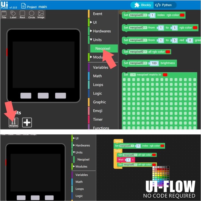 It can be programmed by any type of M5 core. Connected with Grove port. Alternative Port: A, B, C