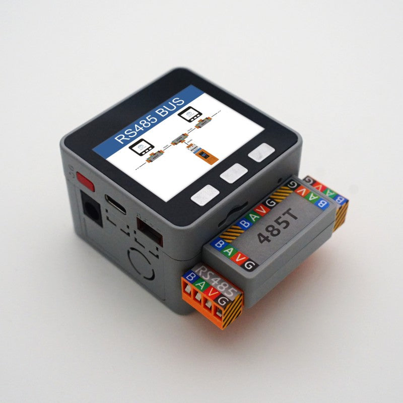 485T,This is a T-shape connector for RS485 communication, which can apply to point to point, one point to multi-point connection, plus a POWER LED for indication. The terminal connector specification is 4pin HT3.96. Many M5 products sharing this type of connector, such as PLC, Base26, HAT-RS485, etc.