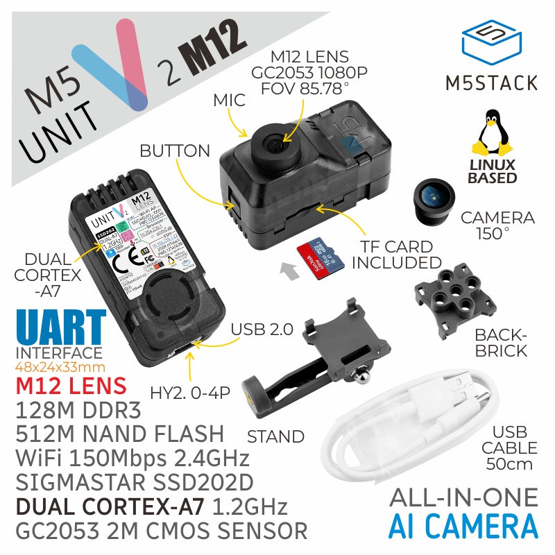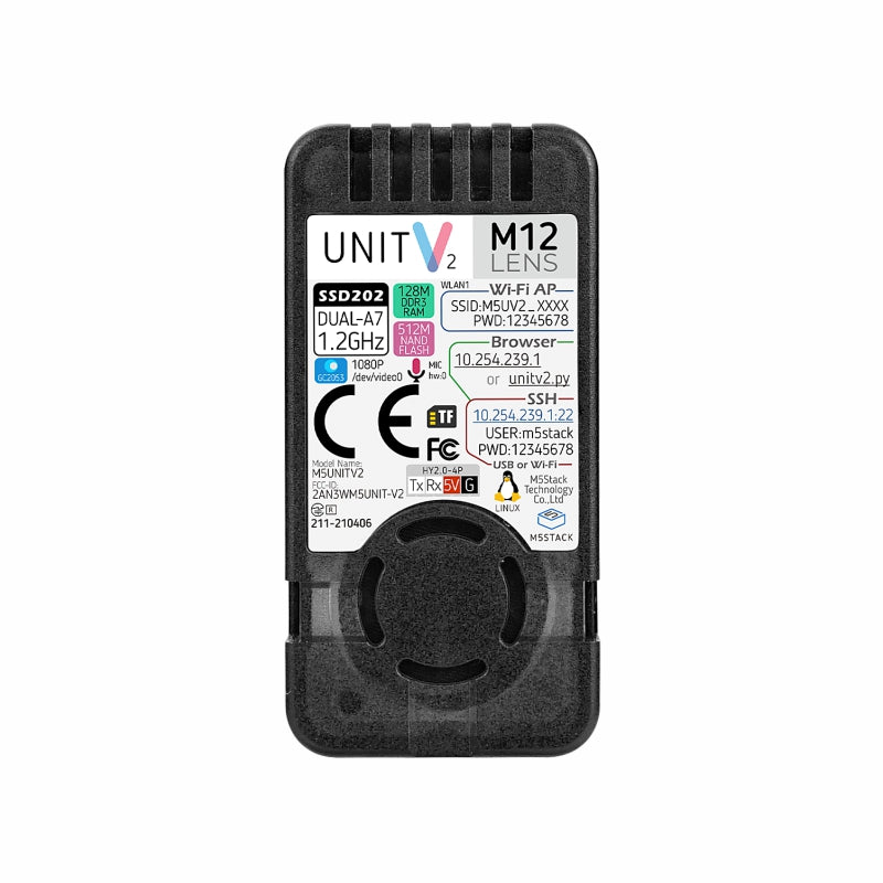 UnitV2 is a high-efficiency AI recognition module from M5Stack, It adopts Sigmstar SSD202D (integrated dual-core Cortex-A7 1.2GHz processor) control core, integrated 128MB-DDR3 memory, 512MB NAND Flash, 1080P camera. Equipped with 1x regular focal length (FOV: 85°) + 1x wide-angle fisheye lens (FOV: 150°) two M12 general specifications lenses, support manual focus adjustment. Embedded Linux operating system, integrated with rich hardware and software resources and development tools brings you a simple and efficient AI development experience right out of the box!