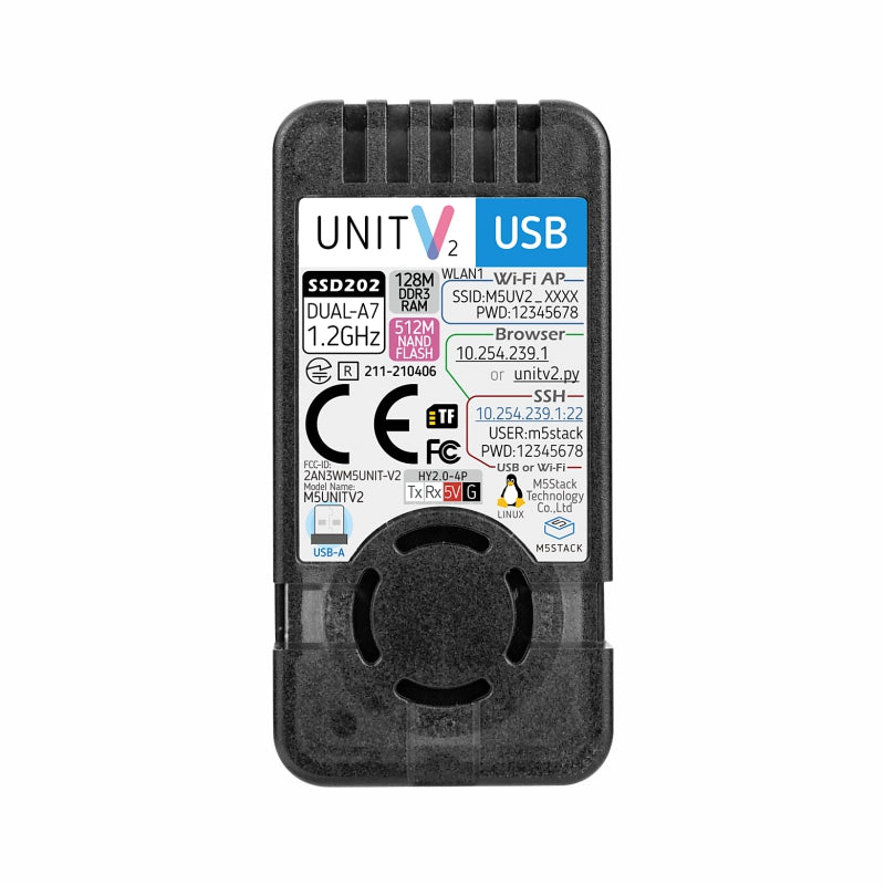 The UnitV2 USB is the latest high efficiency AI recognition module from M5Stack, it adopts Sigmstar SSD202D (integrated dual-core Cortex-A7 1.2GHz processor) control core, 128MB-DDR3 memory and 512MB NAND Flash. It offers USB-A universal interface, which allows you to connect various UVC Cameras, Built-in Linux operating system, integrated with rich hardware and software resources and development tools brings you a simple and efficient AI development experience right out of the box!