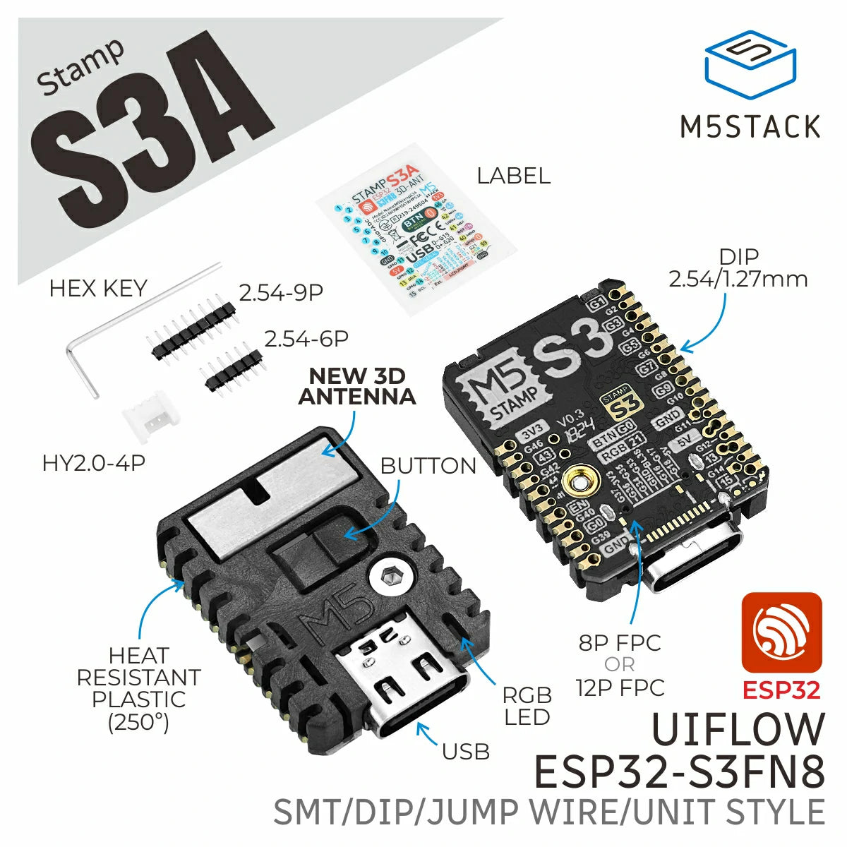 Stamp-S3A is a highly-integrated embedded module based on the Espressif ESP32-S3FN8. It is equipped with a 240 MHz Xtensa® 32-bit LX7 dual-core processor, integrates 8 MB Flash, a programmable RGB LED, and a user button. The deeply-optimized 3D antenna design offers stronger wireless communication performance. Twenty-three GPIOs are broken out and provided via 1.27 mm / 2.54 mm pitch SMT/DIP pin headers or sockets, allowing effortless PCB integration and enabling developers to build applications rapidly.