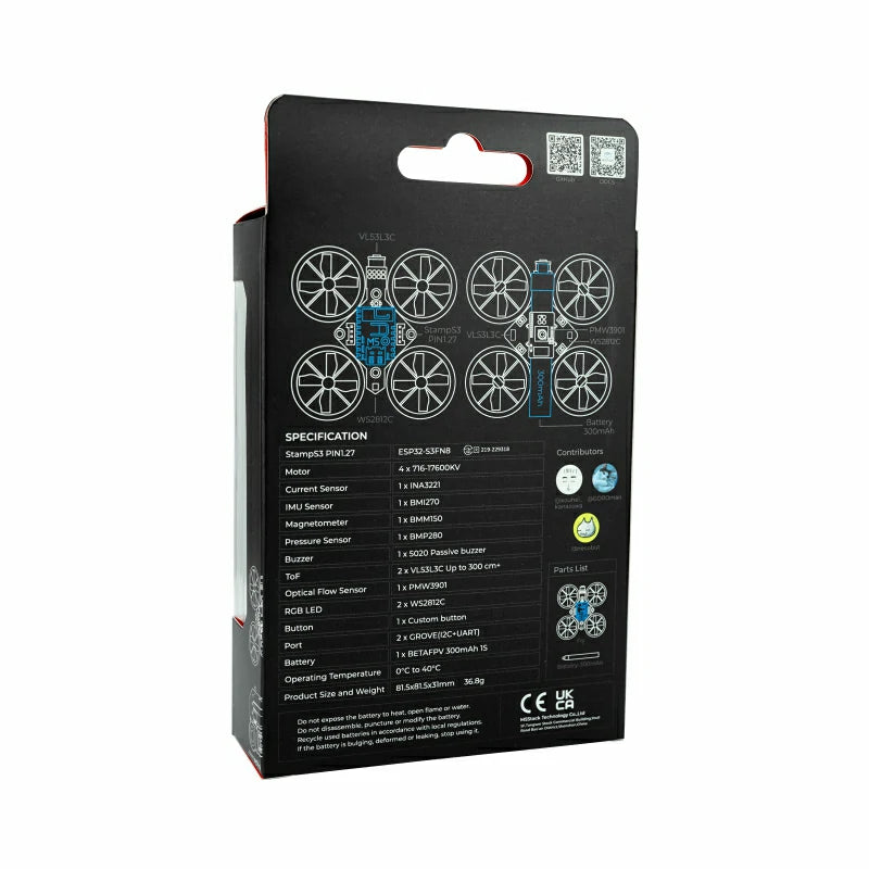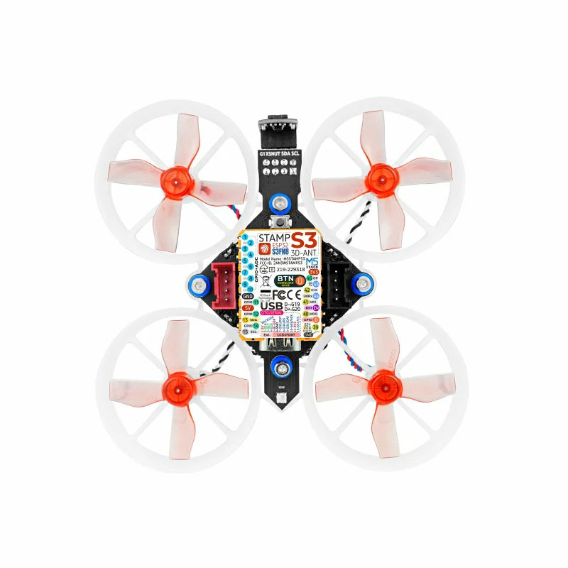 M5Stamp Fly is a programmable open-source quadcopter kit, featuring the StampS3 as the main controller. It integrates a BMI270 6-axis gyroscope and a BMM150 3-axis magnetometer for attitude and direction detection. The BMP280 barometric pressure sensor and two VL53L3 distance sensors enable precise altitude hold and obstacle avoidance. The PMW3901MB-TXQT optical flow sensor provides displacement detection. The kit includes a buzzer, a reset button, and WS2812 RGB LEDs for interaction and status indication. It is equipped with a 300mAh high-voltage battery and four high-speed coreless motors. The PCB features an INA3221AIRGVR for real-time current/voltage monitoring and has two Grove connectors for additional sensors and peripherals. Preloaded with debugging firmware, the Stamp Fly can be controlled using an Atom Joystick via the ESP-NOW protocol. Users can choose between automatic and manual modes, allowing for easy implementation of functions like precise hovering and flips. The firmware source code is open-source, making the product suitable for education, research, and various drone development projects.