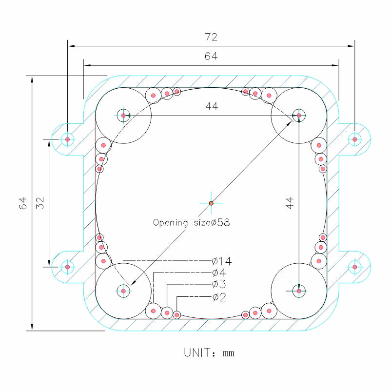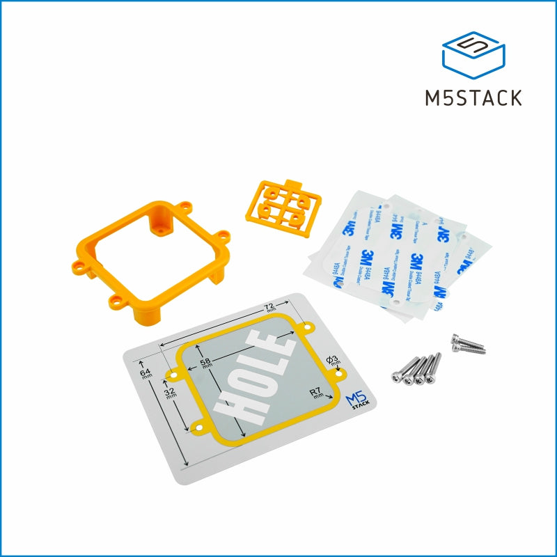 Panel Frame is a frame construction for fixing Core1, Core2 and Tough series M5Core. Offering two installation methods of screw and double-sided adhesive tape. For M5Tough installation, 3M waterproof double-sided adhesive tape can provide waterproof function. For the M5Core (Core1, Core2), four plastic pads are to be installed into four corners of the frame, to make the M5Core surface in parallel with PanelFrame. Customer can choose the method of cutting holes, with the help of attached card paper.