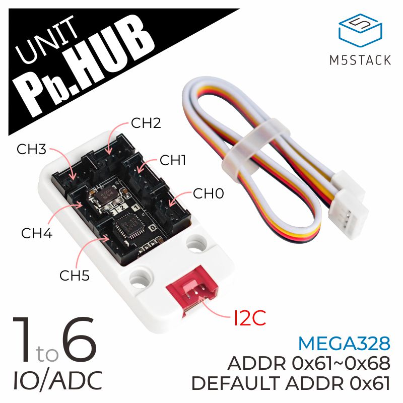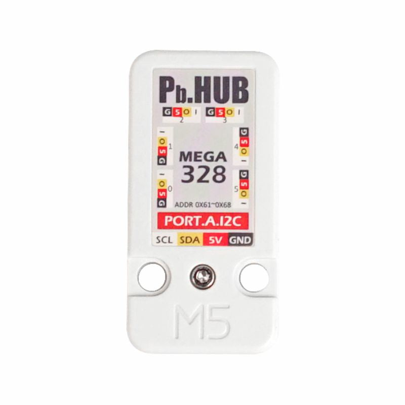 Similar to the PaHub Unit, the PbHub provides solution for multiple devices control using a single port - PortB. With PbHub each of the IO can be configured as input and output, it has a built-in MEGA328 MCU with a simple driver firmware installed.