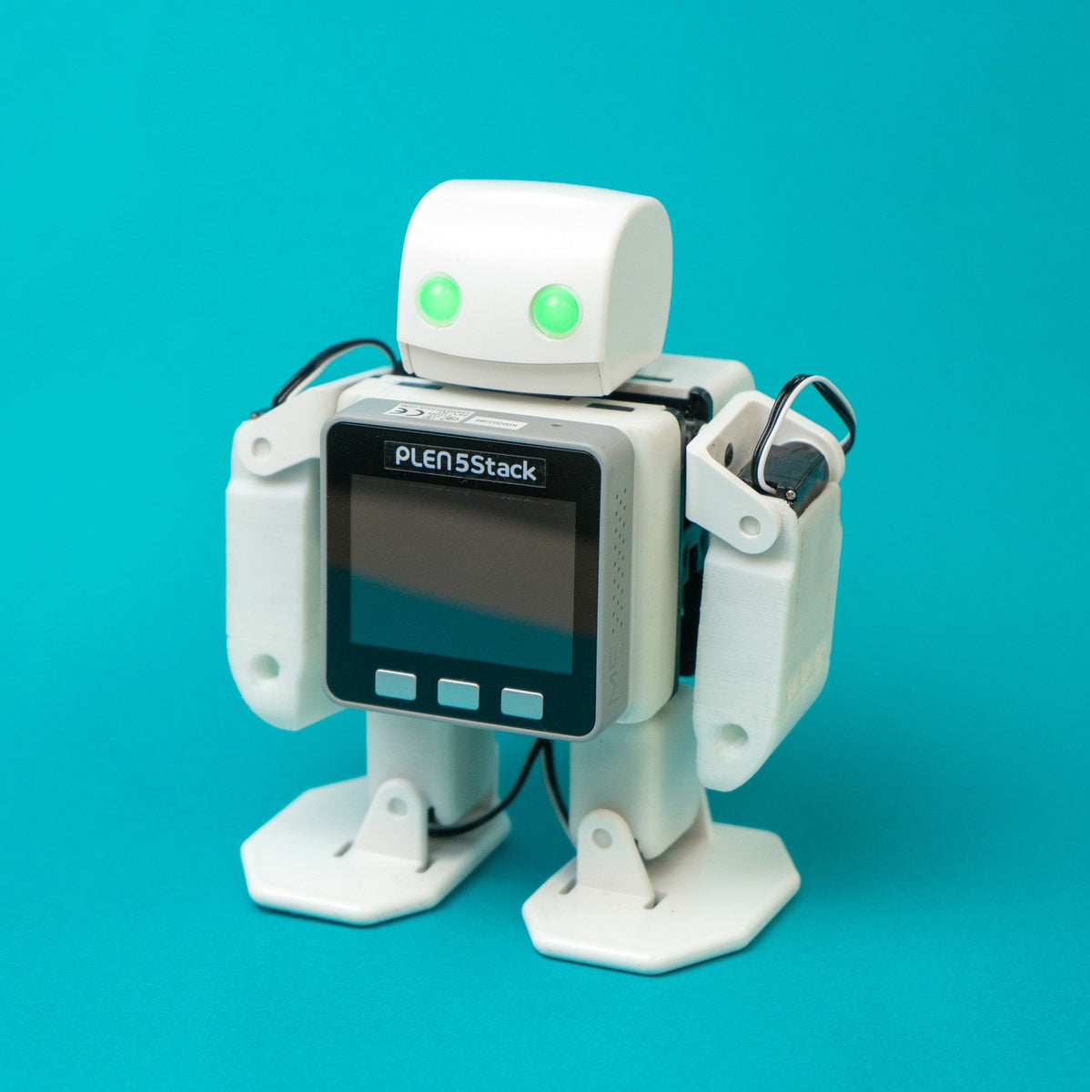 PLEN5Stack is a DIY small bipedal robot that uses M5Stack. It has 8 joints (servo motors) and LED eyes on a 13 cm tall body. It is possible to develop in the Arduino environment, and you can develop IoT and AI robots that combine various sensors and Wi-Fi.