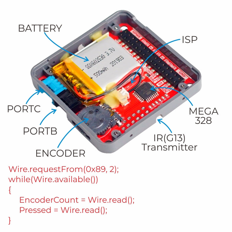 PLUS is a enhanced M5 module comes with lithium polymer battery(500mAh), gear potentiometer, IR transmitter, extend PORT B(GPIO Port), PORT C(UART Port) from M5 core and a Microphone soldering pad. Powered with MEGA328, it could be a great upgrade of the hardware resources by adding up PLUS to your work.