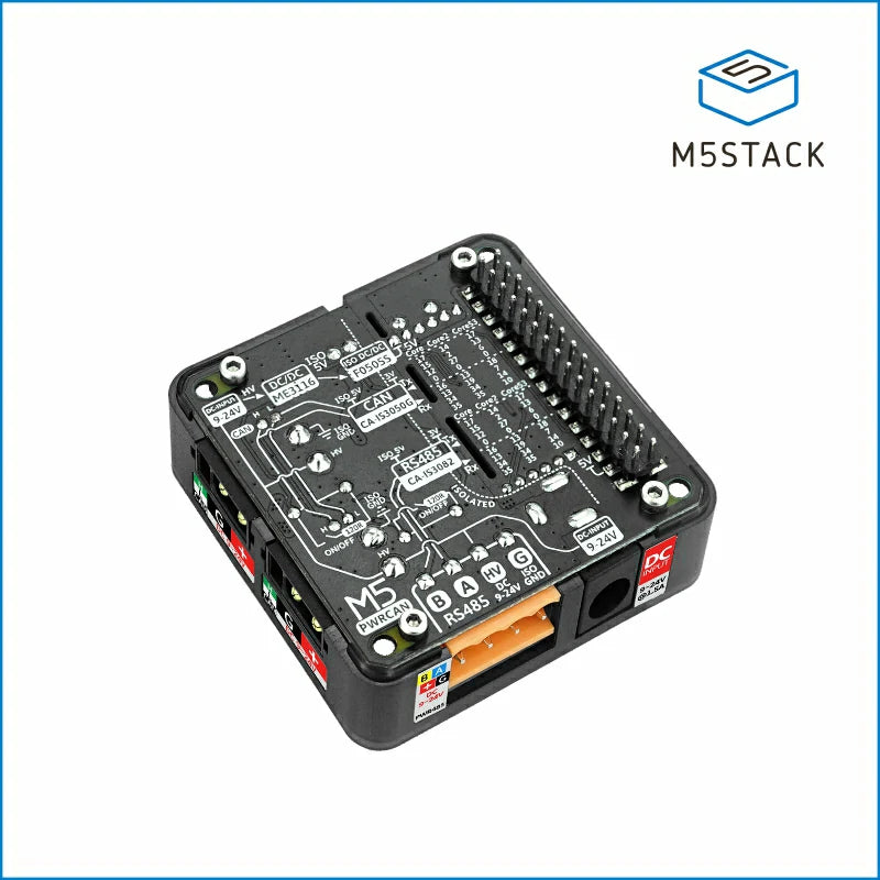PwrCAN Module 13.2 is a multifunctional module designed for the PwrCAN bus, integrating isolated CAN communication and DC 9-24V power bus. The module also includes Pwr485 (with isolation) bus functionality and can provide isolated 5V power supply to the M5 host. The CAN communication part uses the CA-IS3050G isolated transceiver, and the RS485 part uses the CA-IS3082W isolated transceiver. The GPIOs related to CAN and RS485 communication can be selected through dip switches, and the 120-ohm terminal resistance at the CAN and RS485 outputs can also be selected through dip switches. The module's power bus supports DC 9-24V wide voltage input, with the DC socket directly connected to the HT3.96 and XT30 power parts. The built-in isolated power module F0505S-2WR3 provides power to the M5 host. This module is suitable for fields such as robot control, protocol conversion, industrial automation, automotive communication systems, intelligent transportation, and building automation.