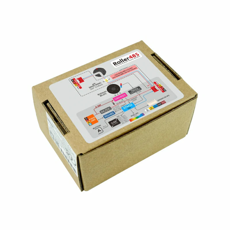Roller485 Unit is a brushless DC motor (BLDC) motion actuator kit integrated with multiple control functions, designed for efficient motion control. The product supports 6-16V DC power input (via PWR485 interface) or 5V input (via Grove interface) and can automatically adjust the power coefficient to ensure optimal performance. It features an internal FOC closed-loop drive system and uses a 3504 200KV brushless motor, with a maximum continuous phase current of 0.5A without forced cooling, and short-term peak current of 1A. The driver uses a magnetic encoder for feedback and supports current, speed, and position control, ensuring precise motion control. The device’s axle can be equipped with an optional slip ring, allowing the top Grove interface to remain connected to the bottom, enabling the expansion of additional modules while supporting 360° rotation, ensuring power supply and data transmission to the rotating part.