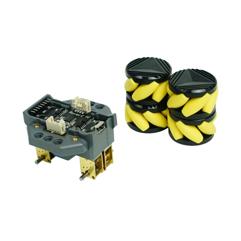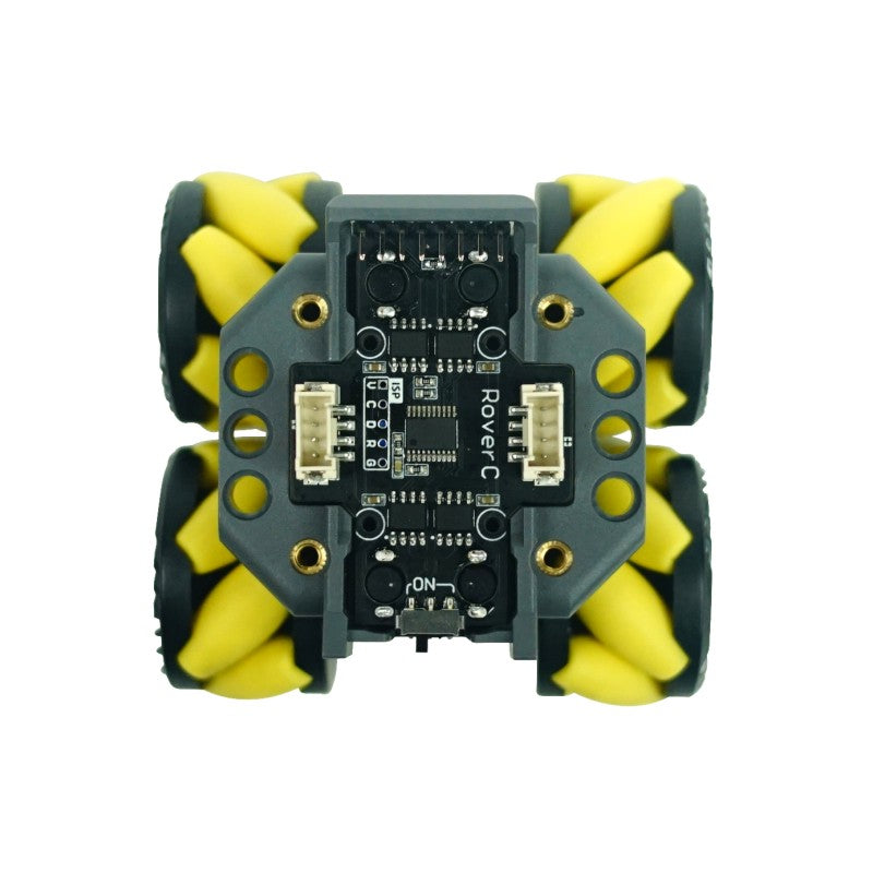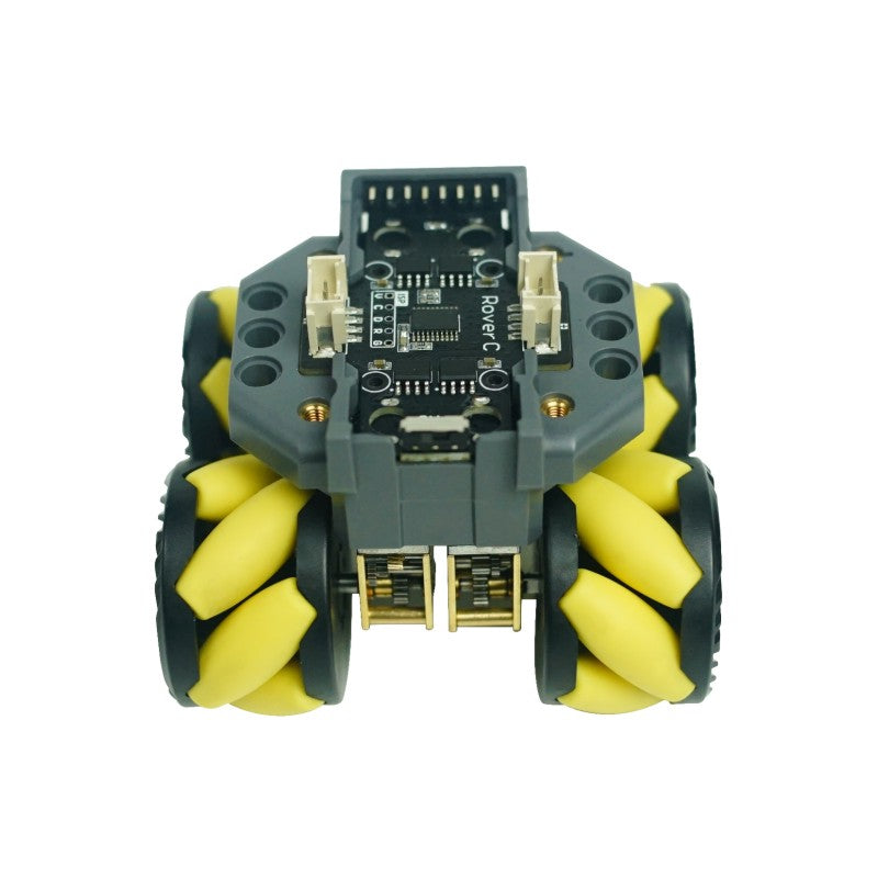 RoverC is a programmable, omnidirectional mobile robot base compatible with M5stickC, and can be started by inserting the M5stickC. The main controller of the base is the stm32f030f4 microcontroller. The base comes with N20 worm gear motors which are directly driven by a four-channel motor driver. These motors are connected to mecanum wheels which can move in all directions. In addition, two grove compatible I2C ports are provided to facilitate the expansion for other modules. The base is also compatible with LEGO bricks and can be expanded in structure. A 18350 battery is installed on the back of the base to meet the power and endurance requirements of the car and can be controlled by an independent switch.