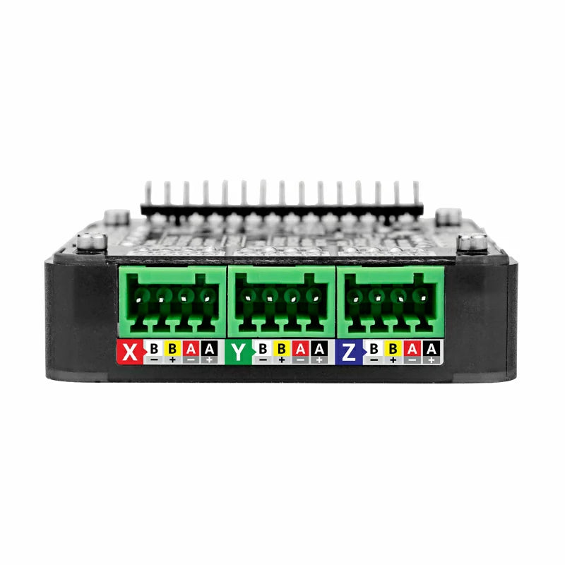 Stepmotor Driver Module 13.2 V1.1 is a stepper motor driver adapted to M5 main control, using STM32+HR8825 stepper motor drive scheme, providing 3-way bipolar stepper motor control interface. After stacking the driver with the M5 main controller, the ESP32 internal signal of the main control directly connects to the driver chip, which can realize independent control or multi-axis motor linkage. The module integrates STM32F030F4P6 chip as IO expansion, provides 4 sets of input signal terminals, 1 set of driver chip enable control, through I2C communication, can control and monitor the reset and status of the driver chip, can be used for external limit switch, motor brake function. The module contains 3 pads to control the 'subdivision mode of 3 sets of stepper motors to realize the subdivision adjustment of stepper motors. The integrated PWR485 communication interface (RS485 + 9-24V power input) and DC-JACK can be used for communication and the power supply mode will be more flexible. Support UIFlow graphical programming, the signal output can be easily configured, and the stepper motor can be controlled more precisely. This module is suitable for a variety of stepper motor motion control scenarios, such as printers, robotic arms, etc.