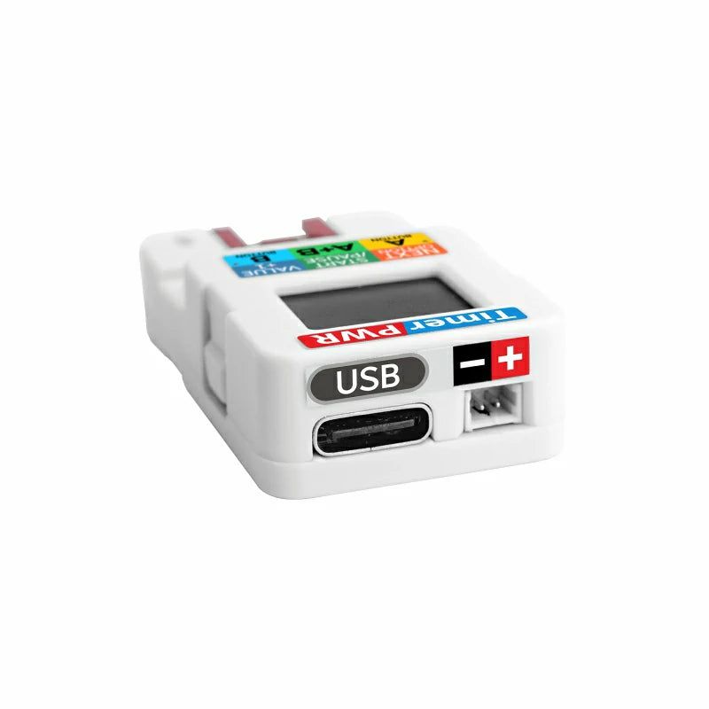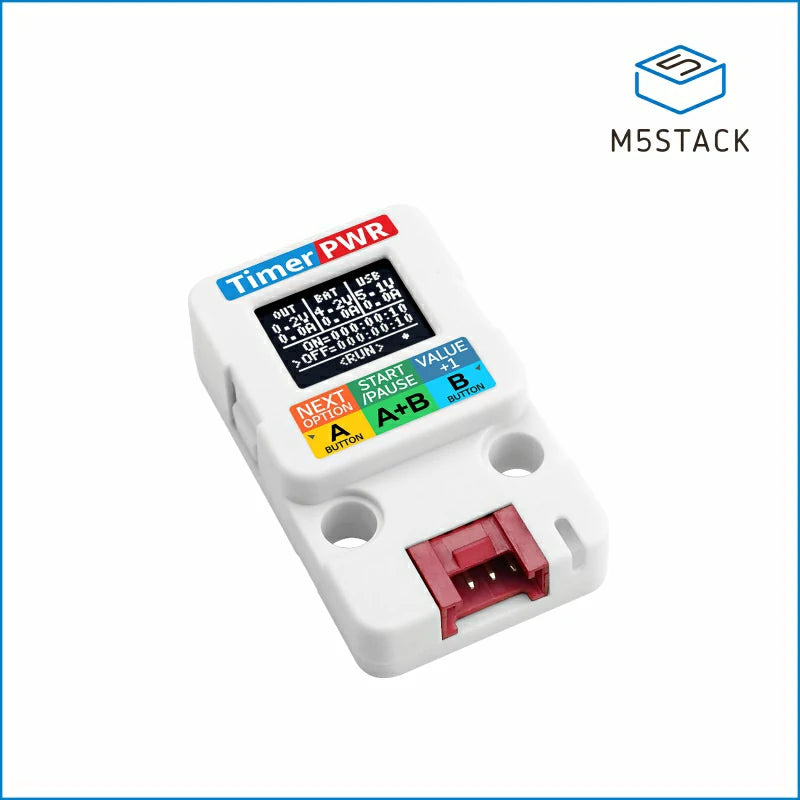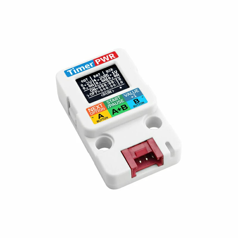 The TimerPWR Unit is a timed power supply unit whose main functions are "charging & discharging + timed switching + screen display + boost output." It features an internal STM32 microcontroller that implements RTC and overall control, allowing users to set automatic power on/off times as needed. It is powered via the Type-C interface and can be connected to an external rechargeable battery via a 1.25-2P interface. The unit includes a built-in battery charging circuit supporting a charging current of 330mA. It also features an integrated DCDC boost circuit that provides a 5V/800mA (1400mA @ 1C battery power) power output to external devices via the Grove port. Additionally, the INA3221 sensor is built-in, allowing real-time monitoring of power input and output current and voltage. The unit is equipped with a 0.66-inch OLED display and two side buttons for user interaction, making it easy to view real-time system status and modify settings. Users can set parameters such as power on/off using the side buttons or via the I2C bus through the Grove interface with I2C commands. This product is suitable for smart homes, industrial automation, and timed control devices.