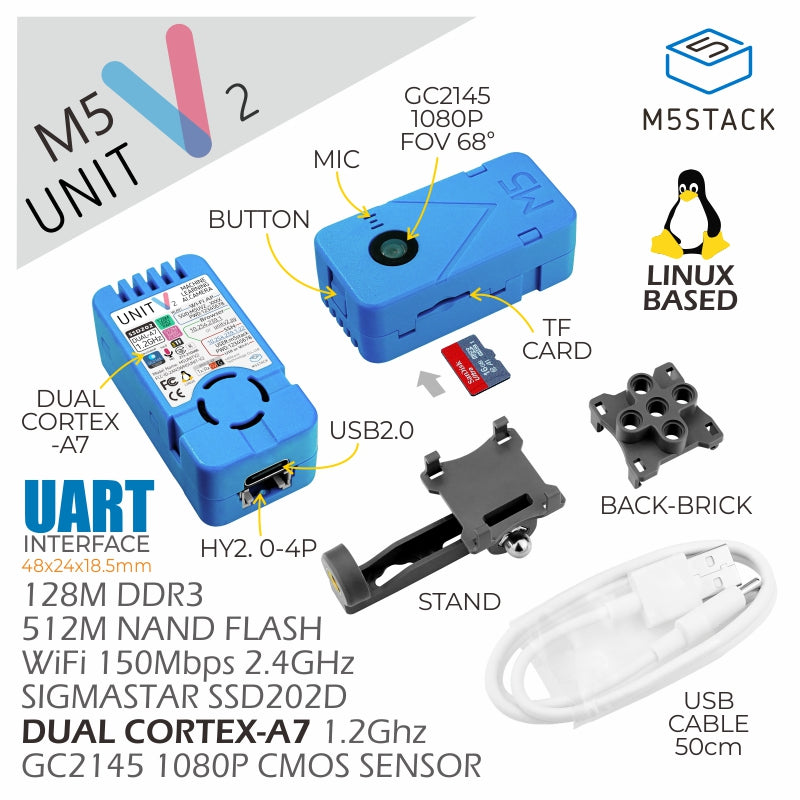 UnitV2 is a high-efficiency AI recognition module launched by M5Stack, using Sigmstar SSD202D (integrated dual-core Cortex-A7 1.2GHz processor) control core, integrated 128MB-DDR3 memory, 512MB NAND Flash, and 1080P camera. With embedded Linux operating system and rich software and hardware resources and development tools integrated, this AI camera is committed to bringing users a simple and efficient AI development experience out of the box.