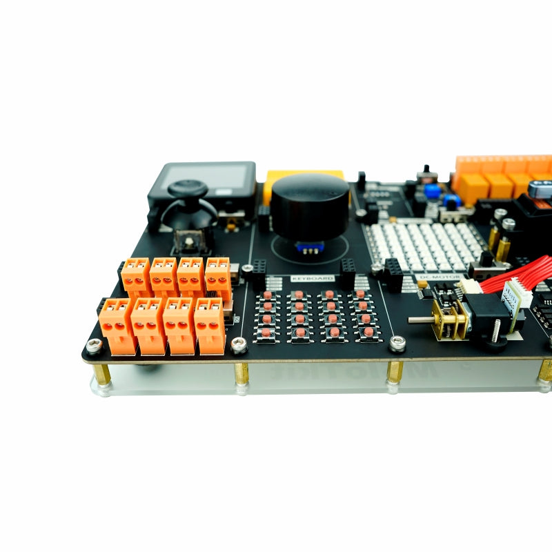 Demo Board. This is a feast of IoT stuff, powered by M5Stack. It is an all-in-one Learning board powered by ESP32, which includes anything you can imagine in an IoT + industrial application scenarios. Let's see what you can do with it: Robotic movement, the most commonly used serial communication port(RS485 RS232), Relay control, all different types of Button control, RF reader, speaker, Microphone and more all able to develope by an M5stack core device, so you can program this ESP32 kits with Blockly(UIFlow), Arduino, and Micropython. Based on application scenarios, we've partitioned them into different functional parts with the good-looking layout and full-function performance. Here comes the most powerful IIoT learning board.